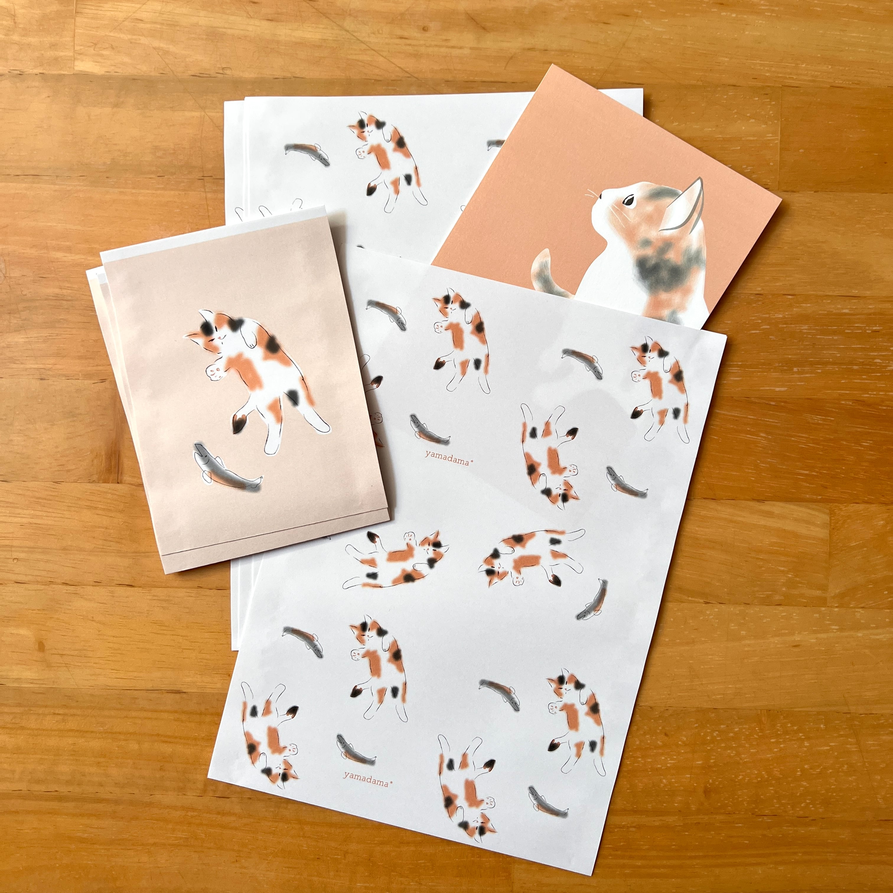 大小2種の三毛猫柄の紙袋がセットになったおすそわけ袋です。ポストカードや紙小物、小分けクッキーなどを入れるのにピッタリなサイズで、友人や家族へのちょっとした贈り物やお裾分けに最適です。